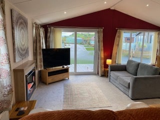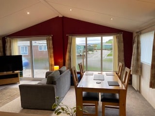 Large lounge/Dining area with electric fire, sofa bed, leather reclining sofa, TV stand, sideboard and oak dining table with 4 chairs. Beautiful views of the hills and Skiddaw from patio doors.