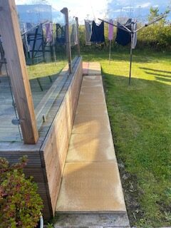 Path to shed at back of lodge with paved area and rotary drier